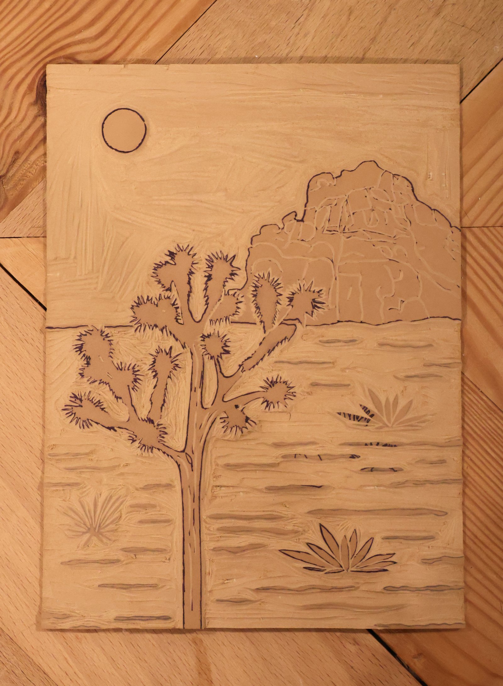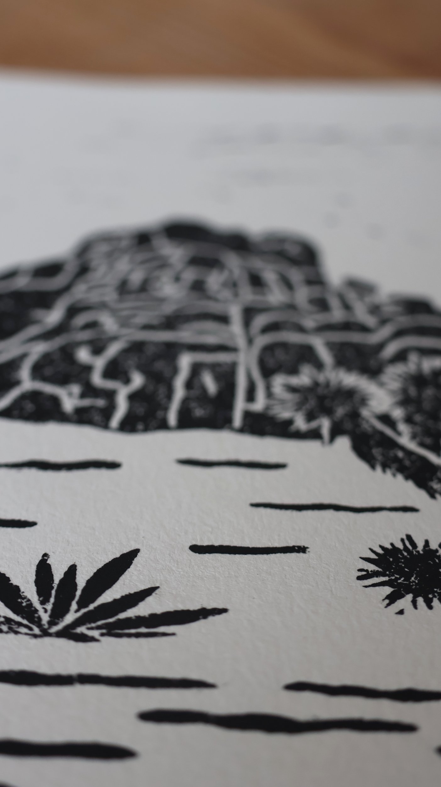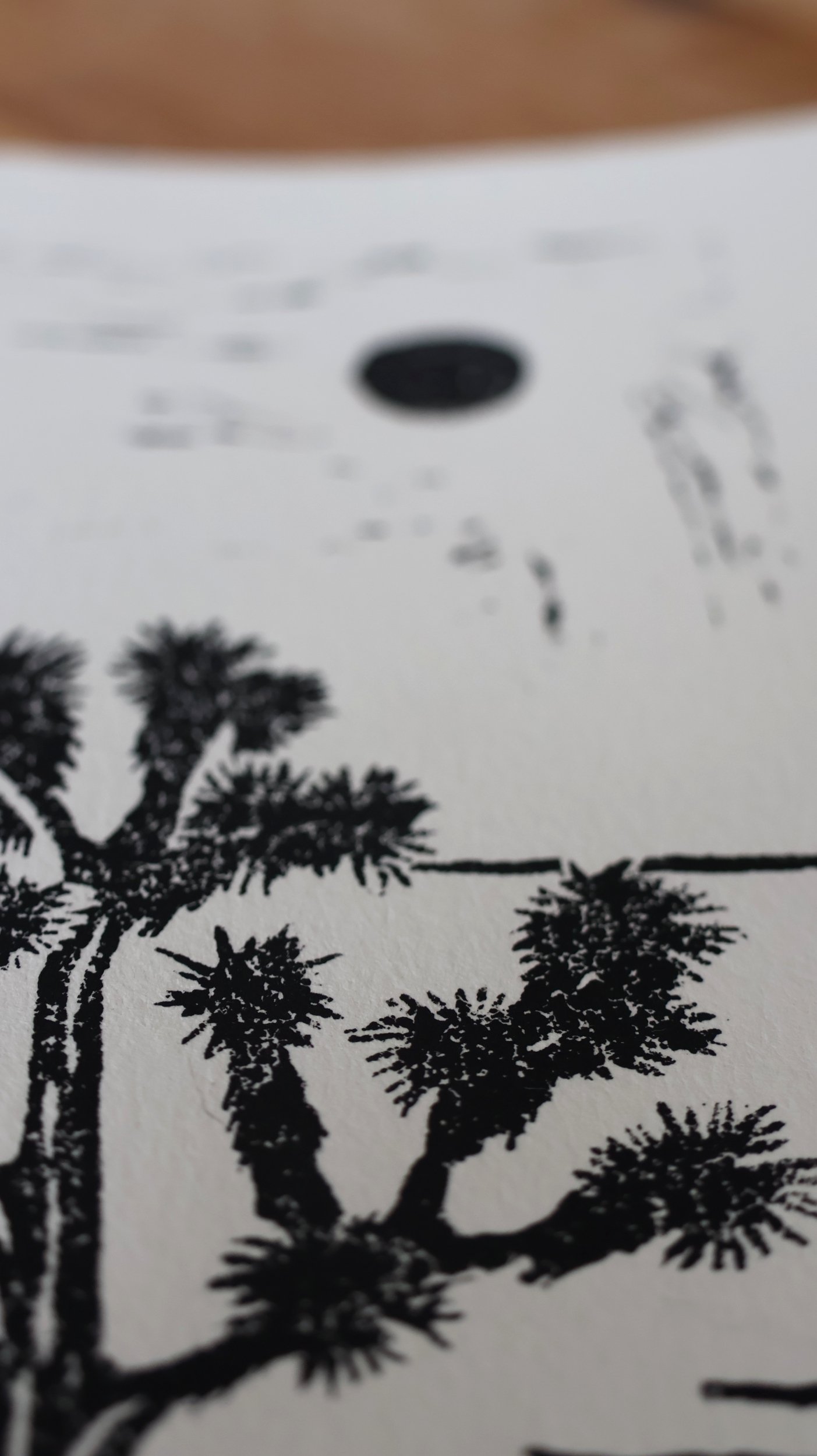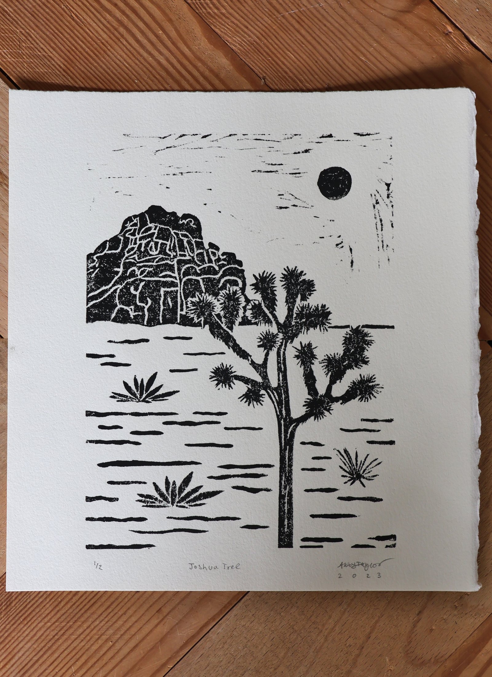 In essence, Joshua Tree National Park is a place of contrasts and harmonies, where the raw beauty of the desert meets the boundless spirit of adventure. It’s a destination that beckons explorers, dreamers, and those seeking solace in nature’s timeless embrace. Measuring 8″ x 10″, it is printed on BFK Rives 115 gsm acid-free 100% cotton paper, using a 6″ x 8″ linocut block.