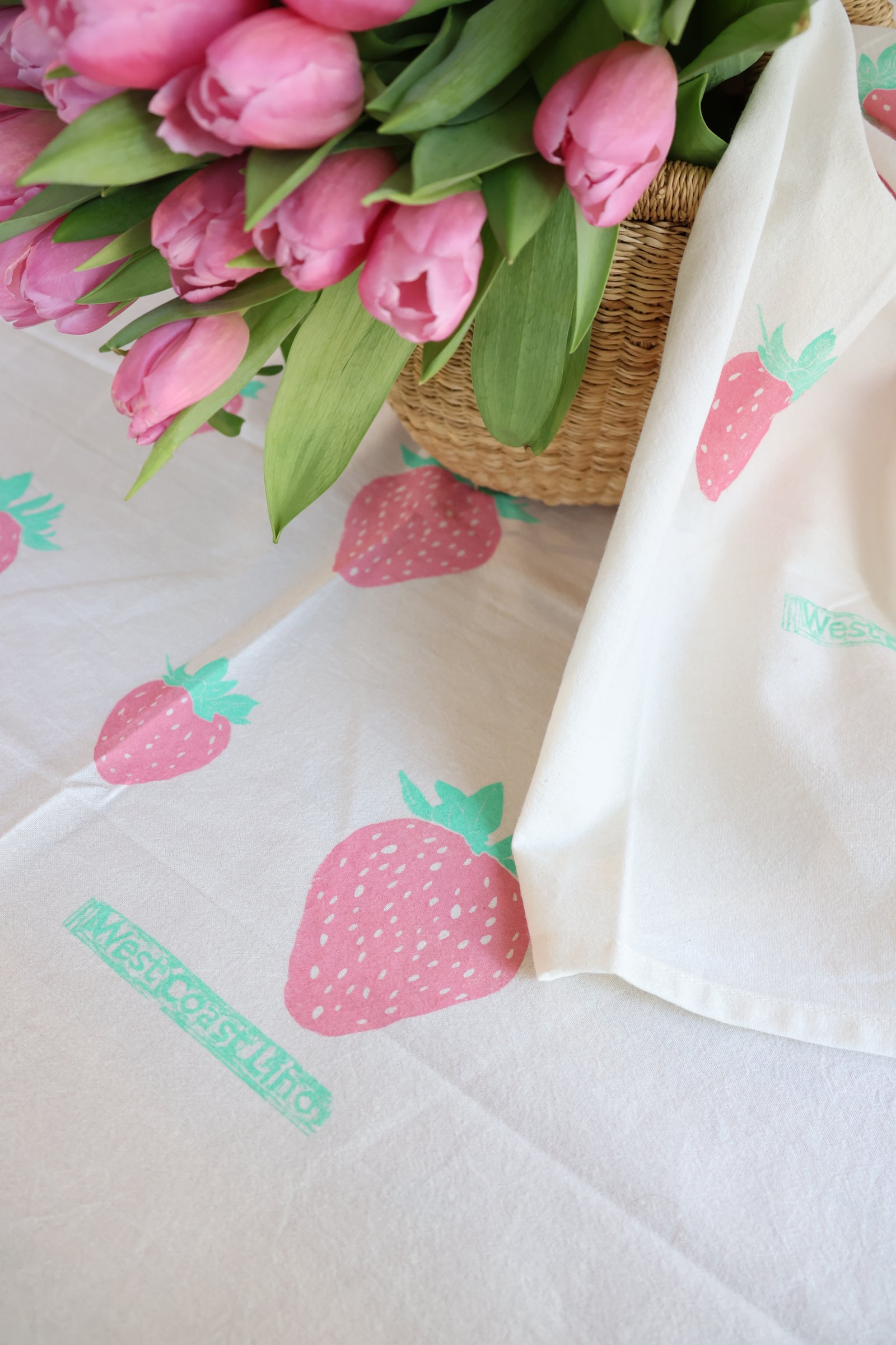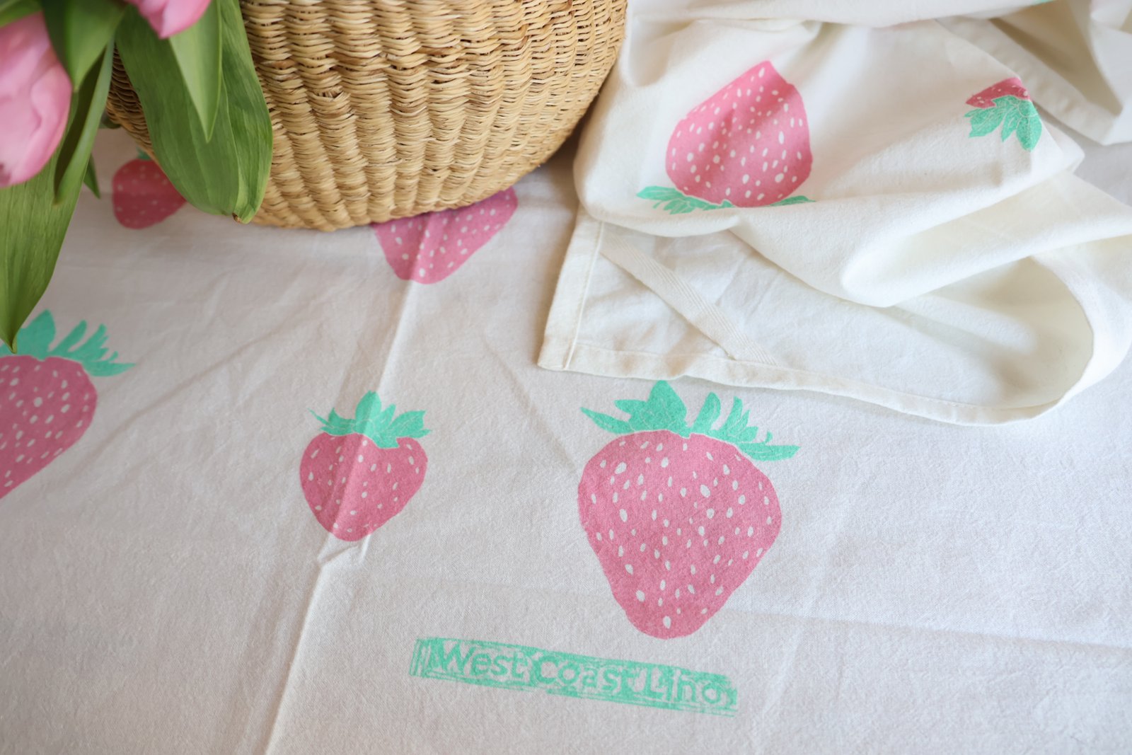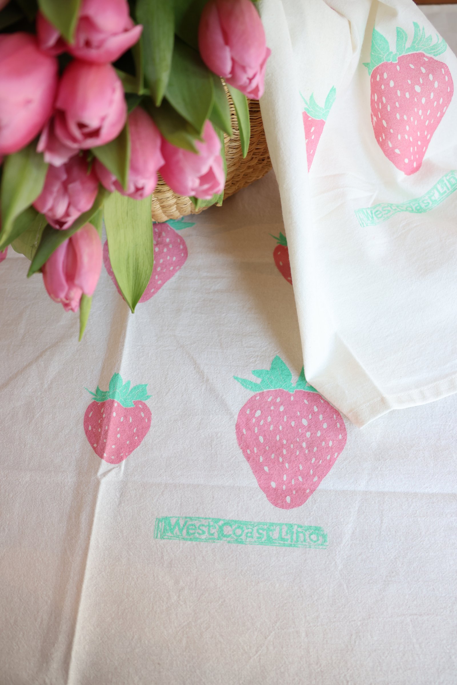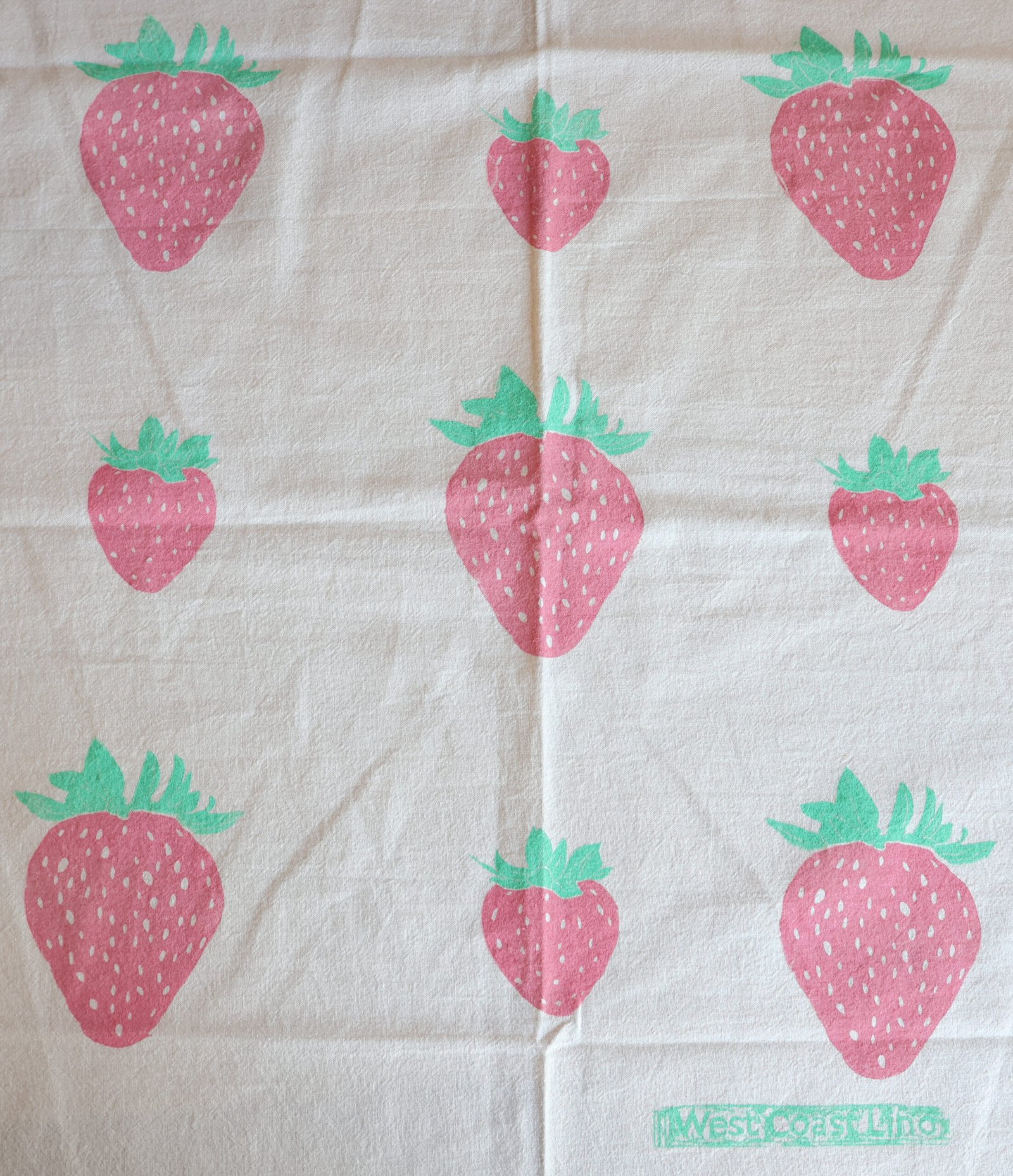 Each towel features a print of nine strawberries, hand-stamped with care using traditional block printing techniques. Because every print is made by hand—not machine—no two towels are exactly alike. Some may have a touch less ink or a slightly off-centered design, and that’s part of their one-of-a-kind beauty.