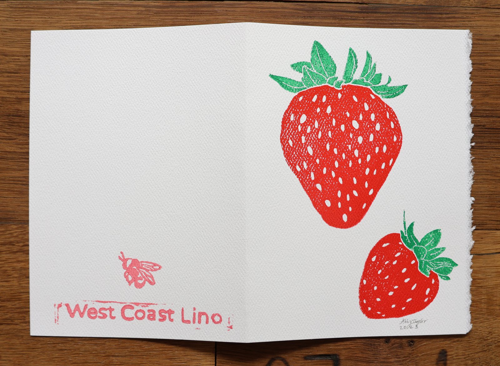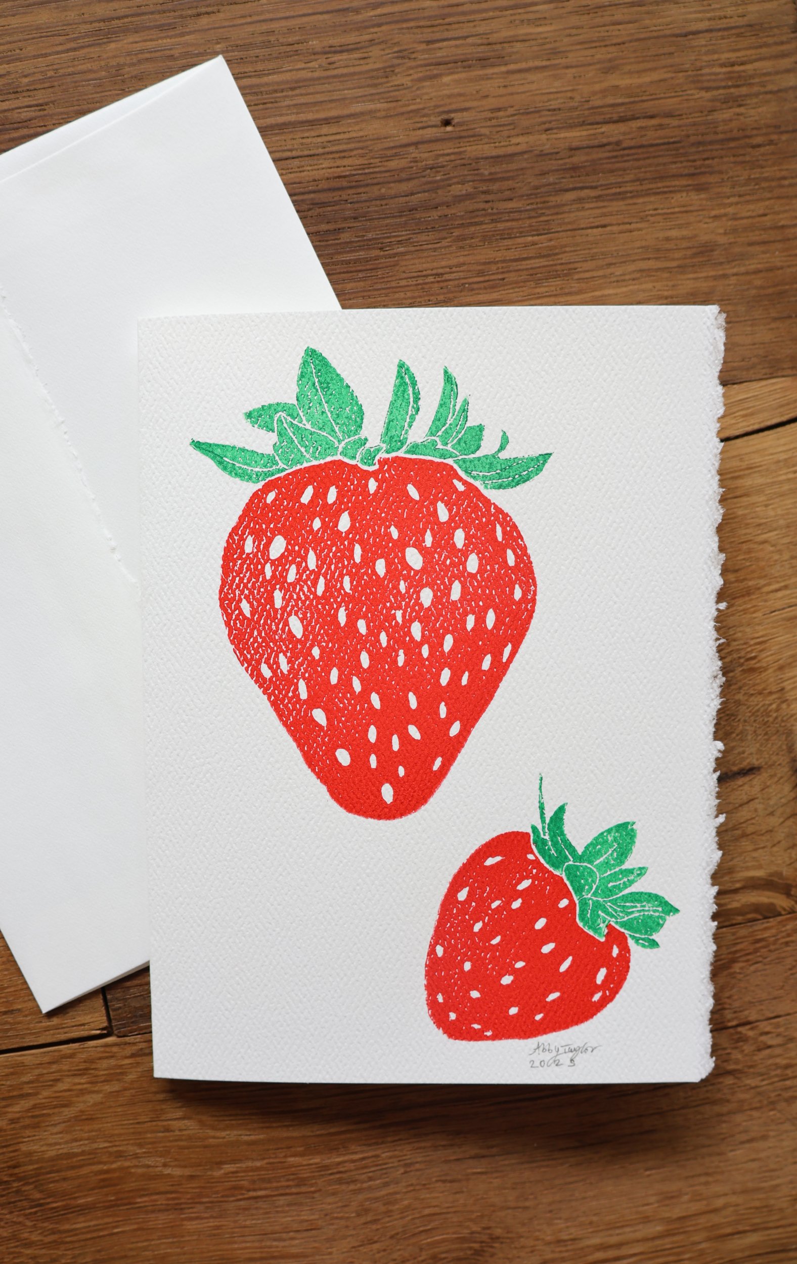 Sweet and simple, this hand-printed card features a vibrant strawberry design. Perfect for summer notes, thank-you messages, or just-because letters, each card is a little piece of art. Each card comes with a blank interior and one envelope. Printed on a 5″ x 6-7/8″ card.