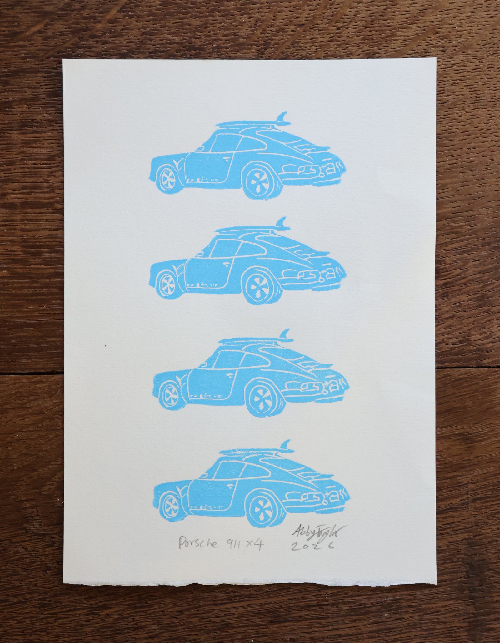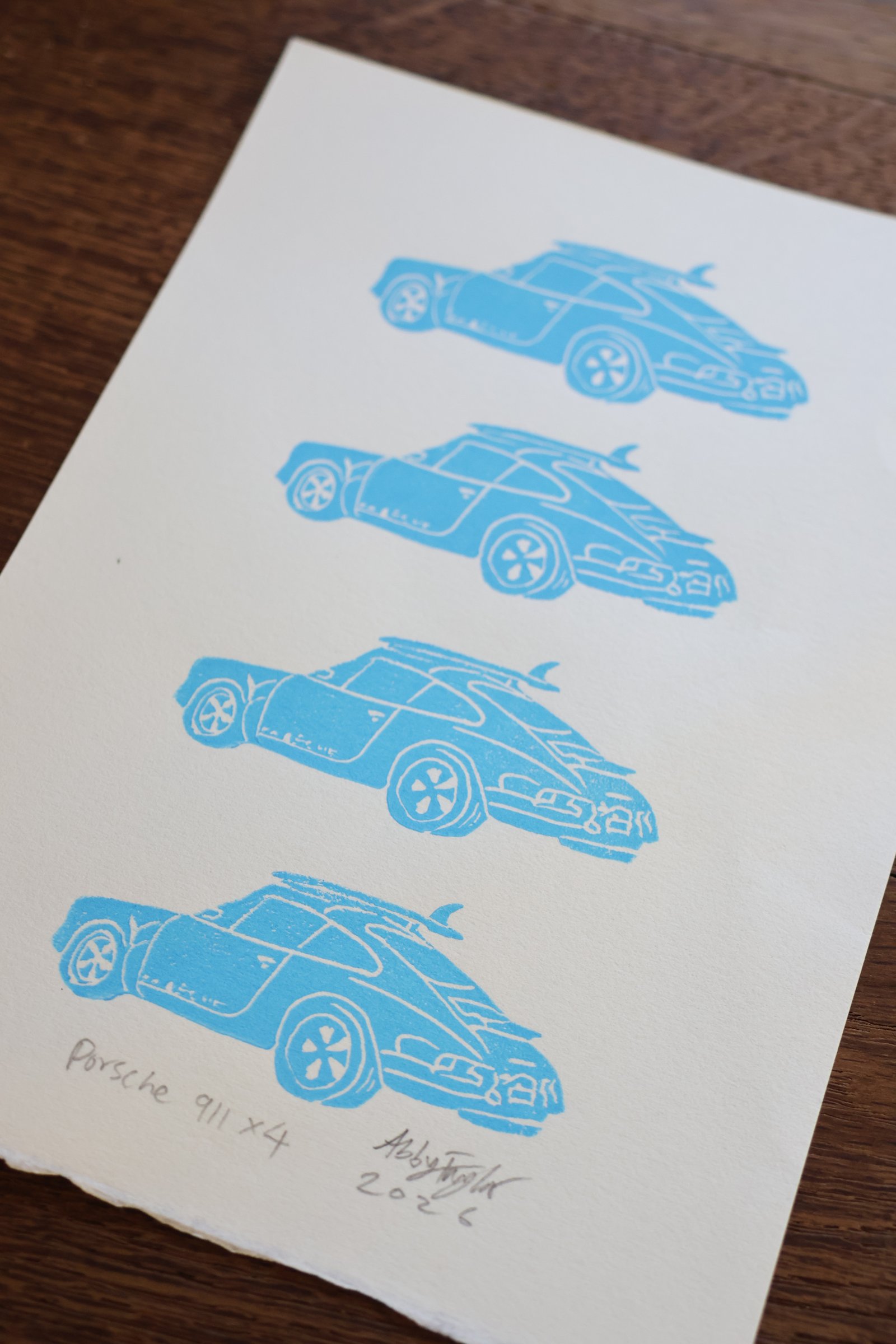 This block print features a mini Porsche 911 with a surfboard secured to the roof rack, printed four times by hand. The repeated composition creates a clean, graphic layout while still showing the natural texture and slight variation of the hand-carved block. Simple, compact, and easy to place, it’s a subtle piece for anyone drawn to classic cars, surf culture, or thoughtful, handmade design. Printed from a 1 1/2″ x 2 1/2″ linocut block on Rives 115 gsm acid-free 100% cotton paper, the final print measures 5″ x 7″.